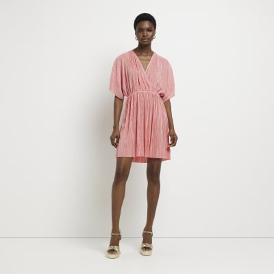 Pink Plisse Short Sleeve Mini Wrap Dress River Island